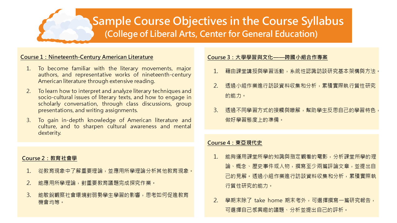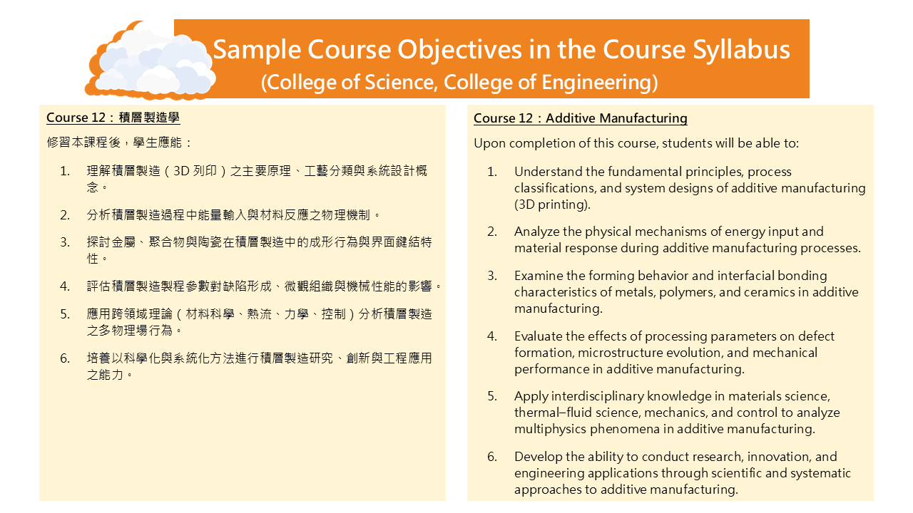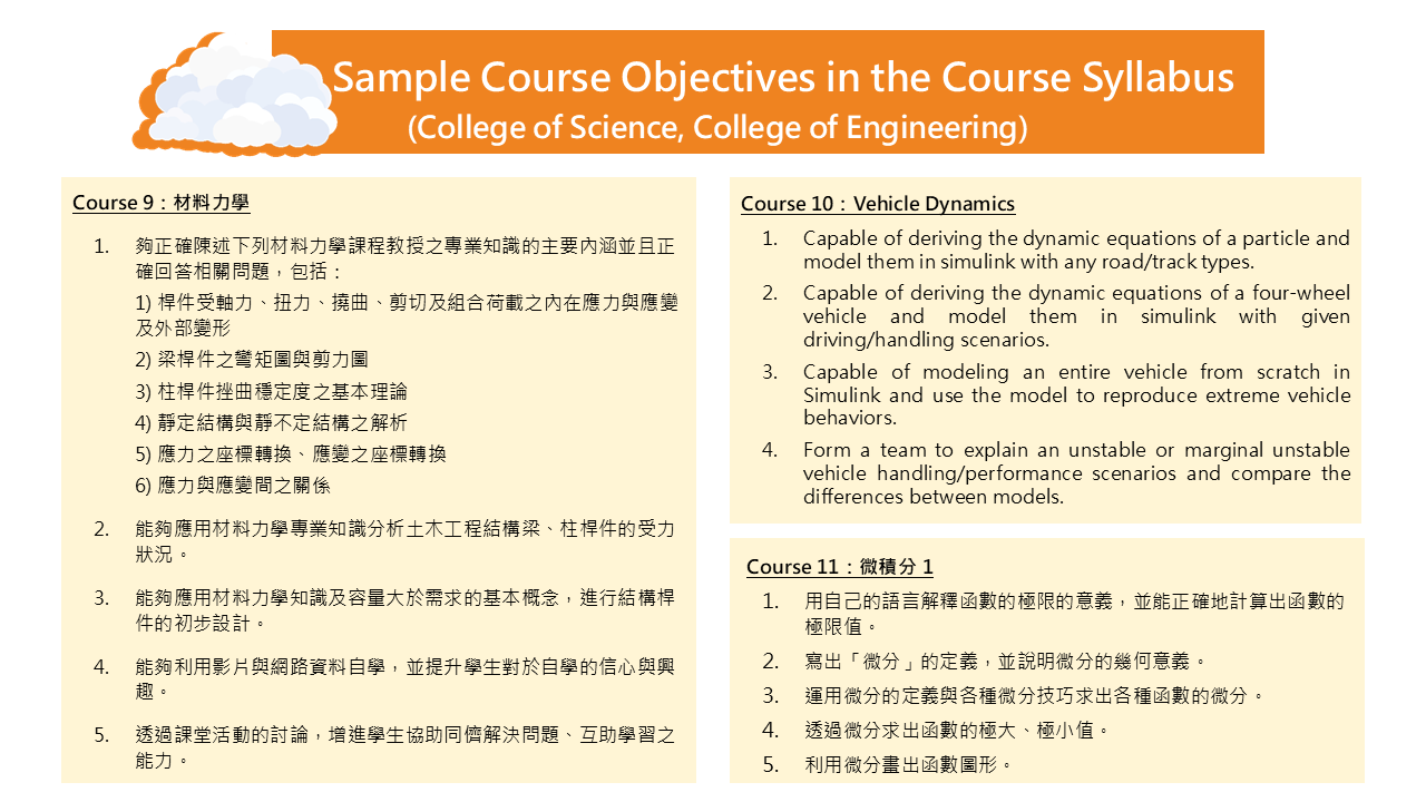 An ideal course syllabus not only helps instructors effectively connect course content planning, teaching activity arrangements, and learning assessment design, but also provides students with clear guidance on the learning abilities they are expected to demonstrate or develop throughout the course. Teaching should emphasize the quality of student learning rather than the quantity of instruction. In alignment with the university’s promotion of learning outcomes–centered course evaluation, course objectives in each syllabus have been incorporated into the Final Course Questionnaires starting from the 111-1 semester.