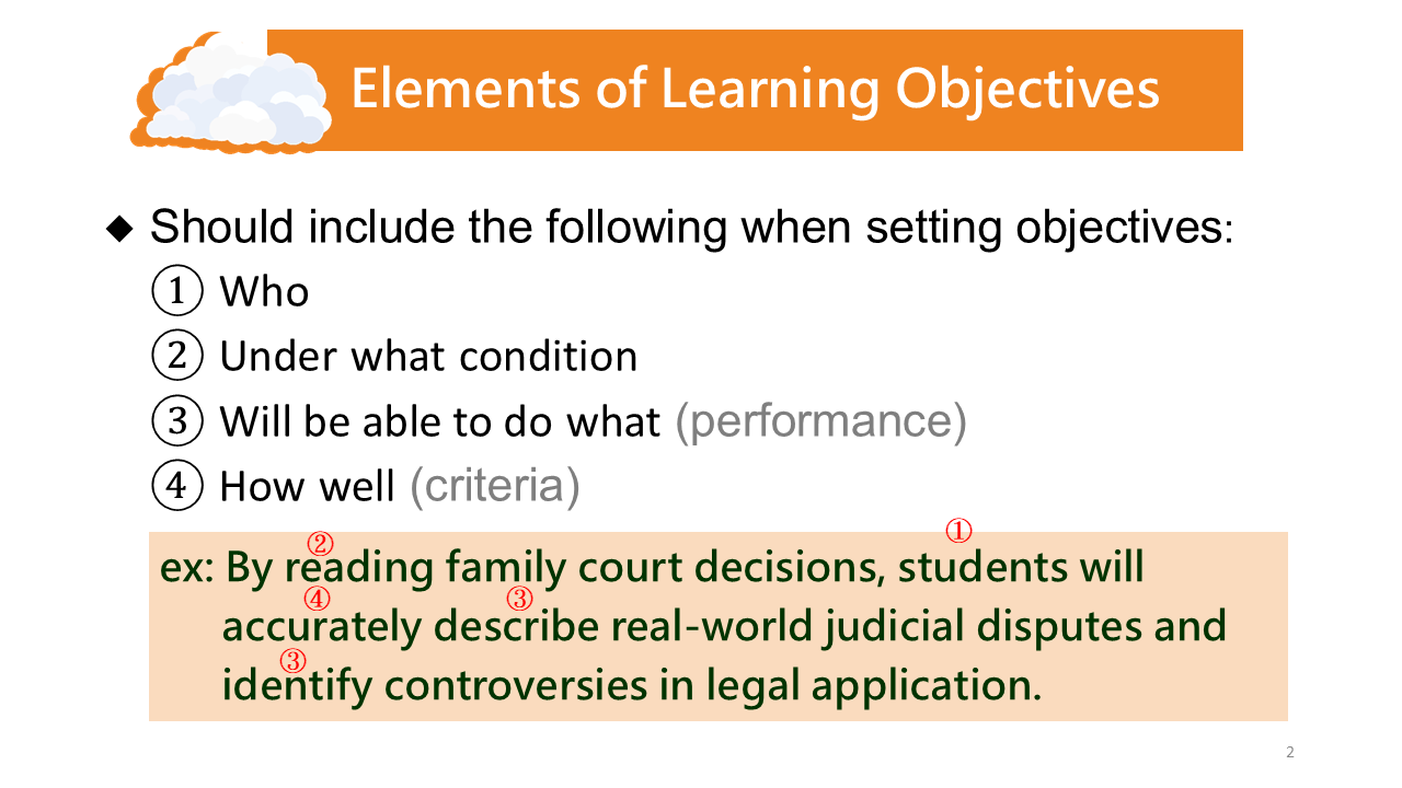 1. Quantity: Course objectives should focus on quality rather than quantity and should consider reasonable learning hours. For a two-credit course, 3–4 objectives are more appropriate.